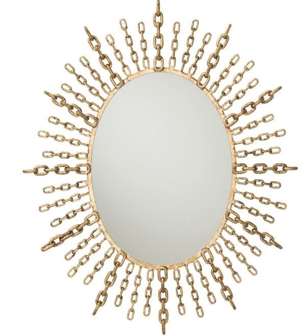H: 41in W: 35.5in D: 1.5in - A new twist on the ever-popular starburst or radiant mirror. Gold leafed iron around a plain mirror.