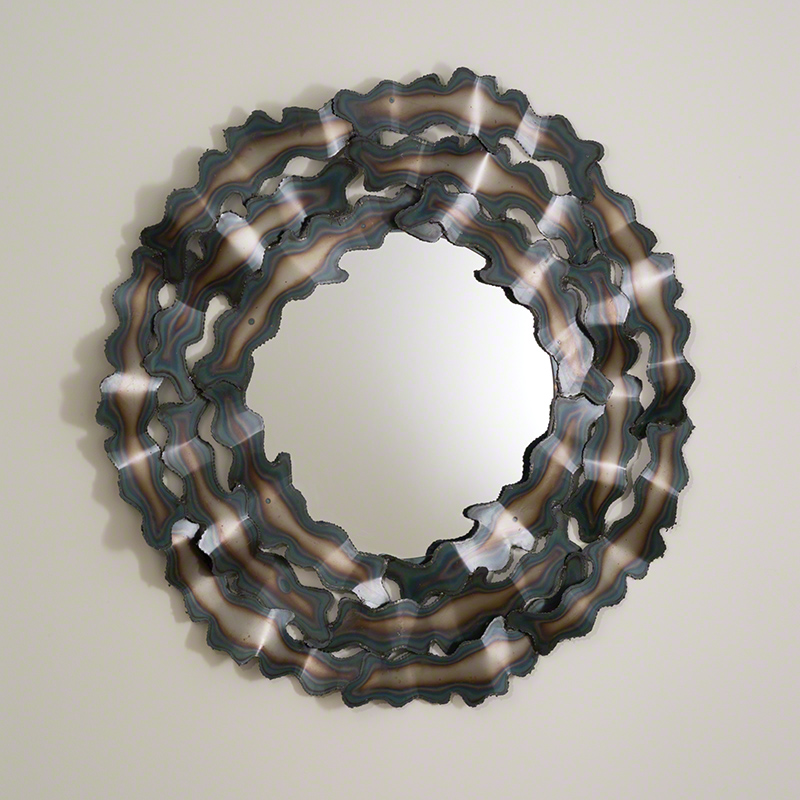 Bands of torched iron ribbons wrap loosely around a looking glass giving the Clouds Mirror a floating, ethereal effect. Hangs with key holes.