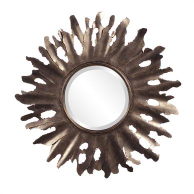 The Compass Mirror is a bold sunburst pattern fashioned from metal. The edges are rough giving the piece a torn look. It then finished in an aged gold giving it an overall rustic look. The Compass Mirror is a perfect focal point for an entryway, bathroom, bedroom or any room in your home. D-rings are affixed to the back of the mirror so it is ready to hang right out of the box! The mirrored glass on this piece has a bevel adding to its beauty and style.