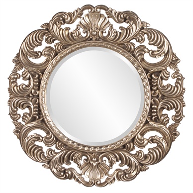 Xander is a lovely piece with a round frame composed of open work scrolls designed in a Baroque style. It is then finished in a warm antique champagne silver leaf. The Xander Mirror is a perfect accent piece for an entryway, bathroom, bedroom or any room in your home. D-rings are affixed to the back of the mirror so it is ready to hang right out of the box! The glass of the mirror is beveled adding to its style and beauty.