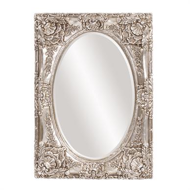 An ornately carved rectangular frame with oval mirror in an antique silver finish.