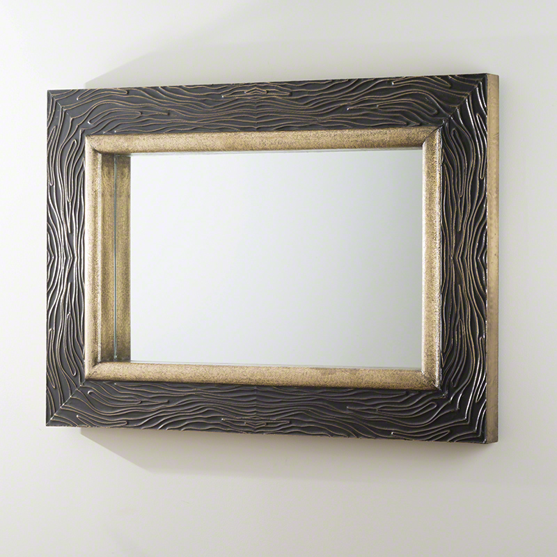 The Forest Mirror exhibits an abstract faux bois pattern in a mix of brass and bronze finishes. The substrate is wrapped entirely in brass sheet which has been hand embossed with the forest pattern. Next the frame is given an oiled bronze finish and the faux bois relief is rubbed to expose the golden brass underneath. Brass Filet. The mirror has both vertical and horizontal metal wall cleats preinstalled.