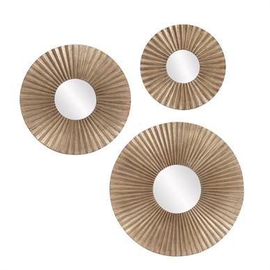 The Malinda Mirror Set is characterized by a pleated frame with scalloped edges. The pieces are then finished in a silver leaf accented with bronze adding to their richness and beauty. The set includes a small, medium and large mirror. They are a perfect focal point for an entryway, bathroom, bedroom or any room in your home. D-rings are affixed to the back of the mirrors so they are ready to hang right out of the box! The mirrored glass on these pieces is NOT beveled.