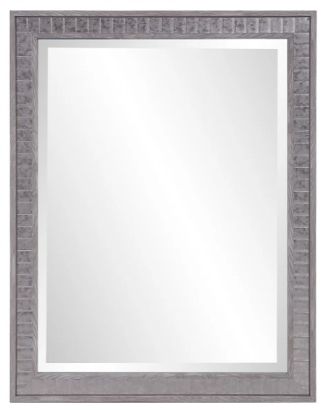 The versatility of the Metropolis mirror is that it moves in and out of many different design styles effortlessly. Modern yet classic can both describe this double-edged frame with an inlaid pattern and surrounding a beautifully beveled center mirror. The warm gray tones of the faux wood frame is part of many of todays hottest design trends.