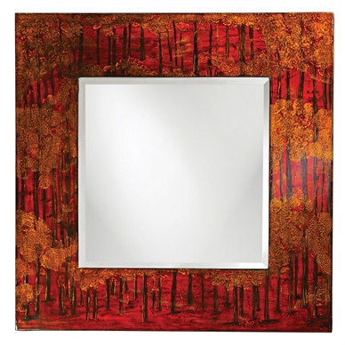 Our Mia Mirror is the epitome of functional art. It features a square wood frame that is painted in a vivid red lacquer. On top of that is bold drips of black lacquer running down the frame. Then on top of that are sponged gold leaves. All together, the piece takes on the look of a very abstract autumn forest. Each piece is hand finished ensuring that no two are exactly alike! The Mia Mirror is a perfect accent piece for an entryway, bathroom, bedroom or any room in your home. D-rings are affixed to the back of the mirror so it is ready to hang right out of the box in either a square or diamond orientation! The mirrored glass on this piece has a bevel adding to its beauty and style.