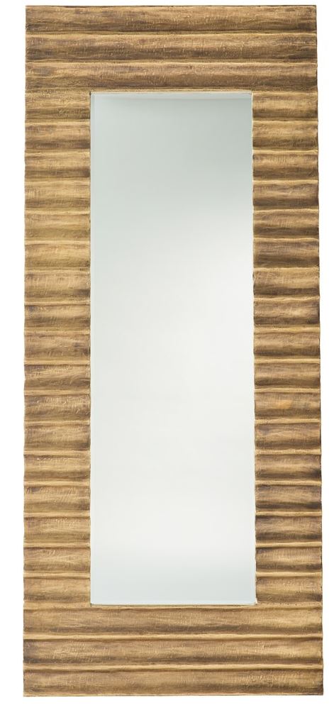 H: 61in W: 26in D: 1.5in - We start with a solid wood frame and hand rout the ribs, giving it dimension. Then we clad it in antique brass, which further enhances the highs and lows of the surface. This design looks great when hung in combination with other brass clad mirrors like (6380), or imagine four of them down a hallway. The plain mirror has a one-inch bevel. Can be hung vertically or horizontally with a security cleat hanger.
