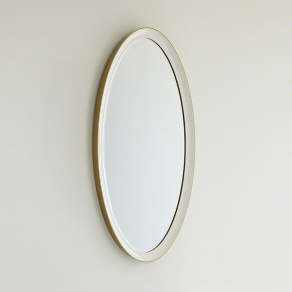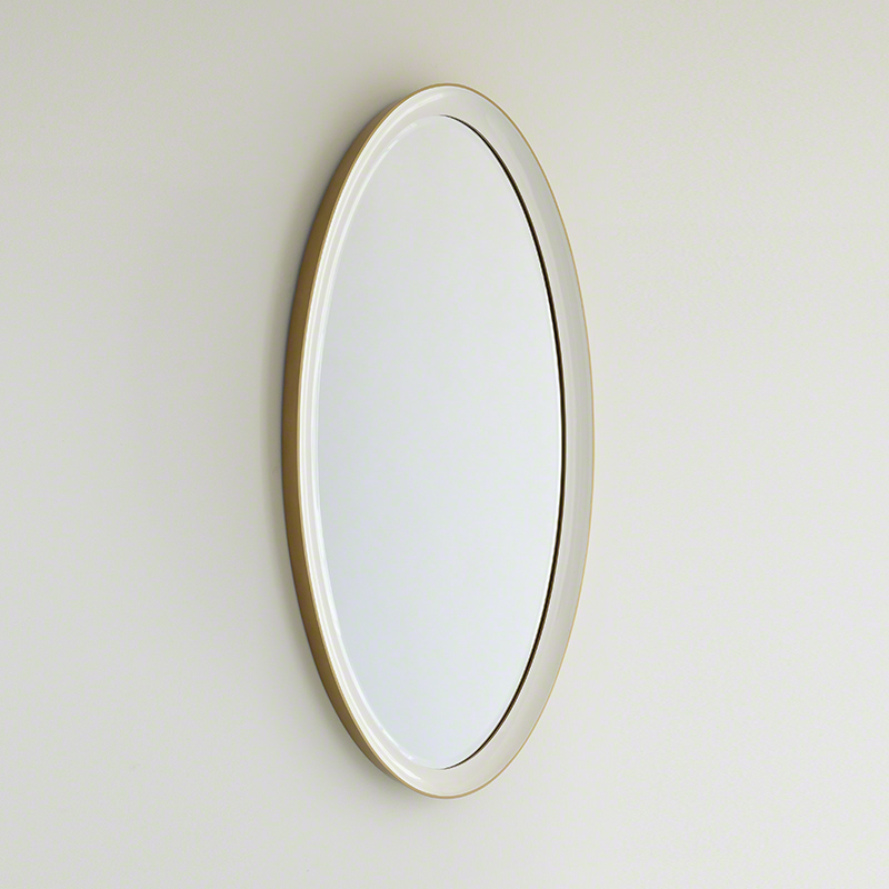 A perfectly beautiful oval-shaped mirror; custom-mixed white and gold high-gloss lacquer, gold ombre finish. A one-inch bevel surrounds the mirrored glass