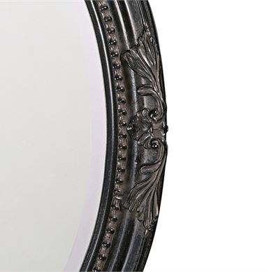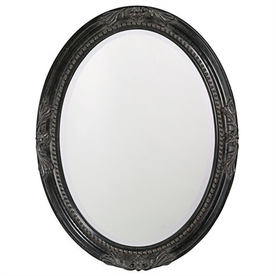 The Queen Ann Mirror features an antique black finish. The oval frame is made from wood and is accented with a beaded textured inset and decorative adornments on each side of the frame. For more added detail the mirror features a one inch bevel. Its Traditional style makes this mirror a favorite for bringing some flair to your decor. This simple yet stunning piece would be a great addition to any room. It is a perfect focal point for an entryway, bathroom, bedroom or any room in your home. D-rings are affixed to the back of the mirror so it is ready to hang right out of the box in either a horizontal or vertical orientation!