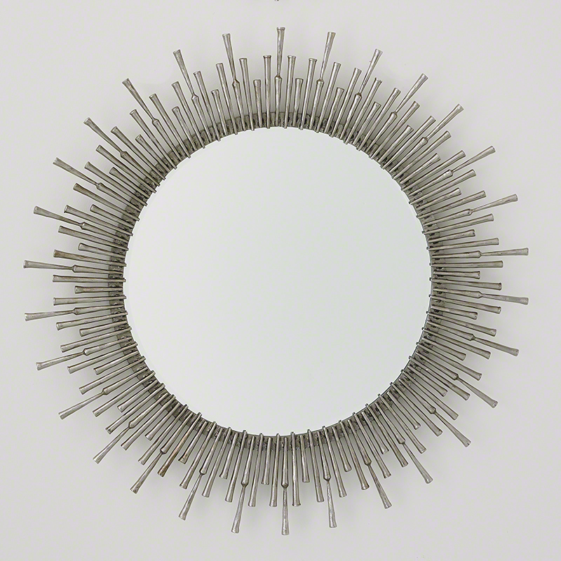 Antique nickel-plated, hand-forged iron spikes are assembled to create this inspired and stunning hand-crafted mirror. Beveled mirror. Also available in antique brass-plated finish.