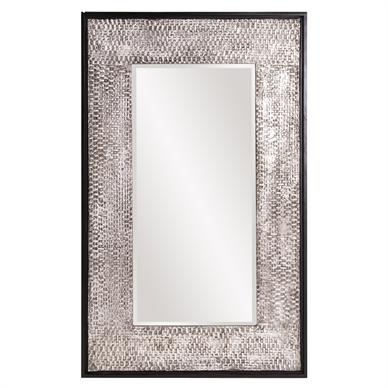 This rectangular mirror is characterized by a weathered, woven texture finished in silver with black highlights. It is then trimmed in a black boarder.